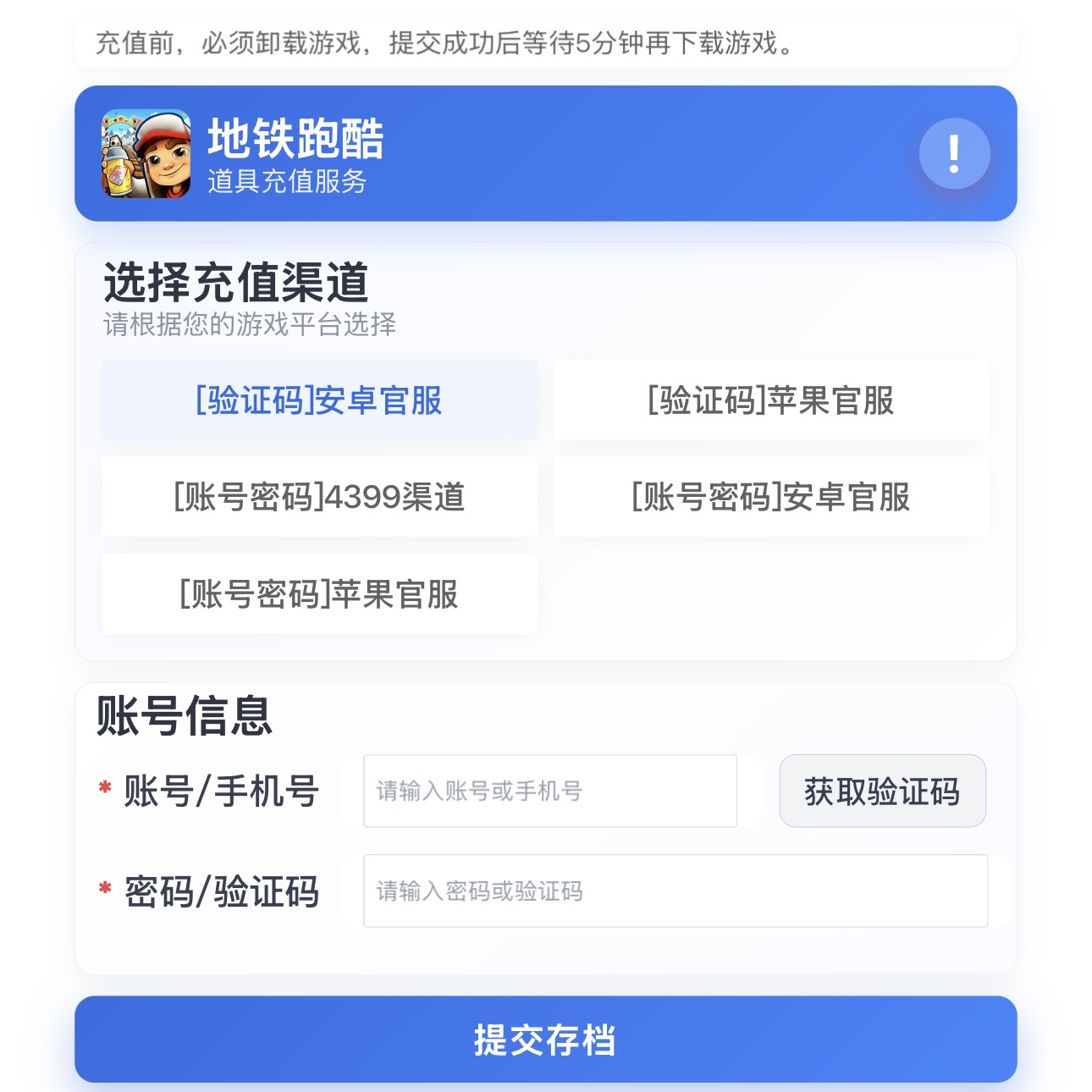 本站直充仅支持官服、4399渠道服